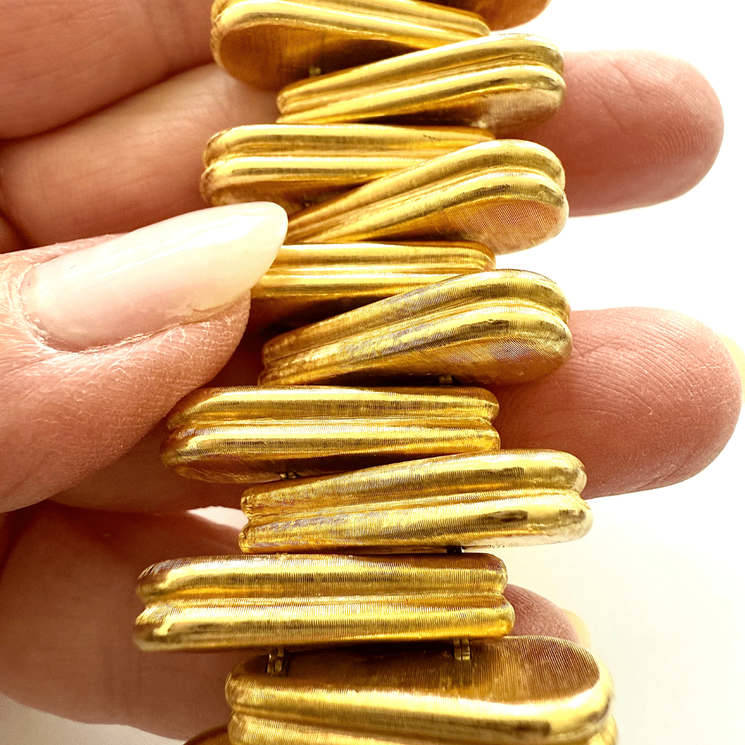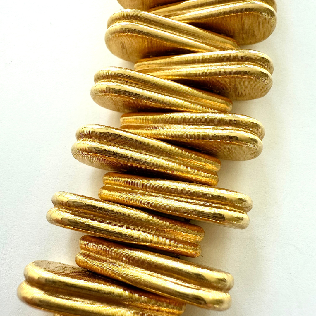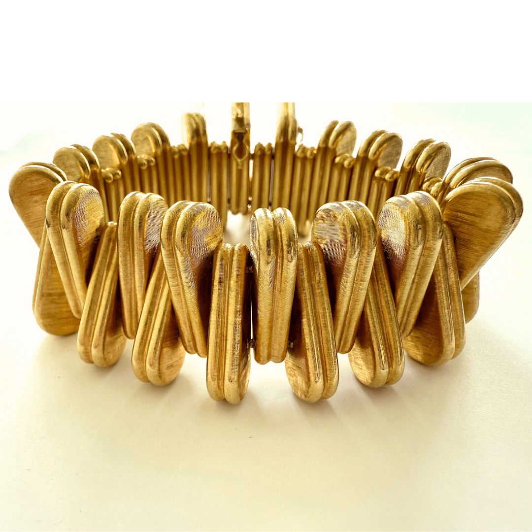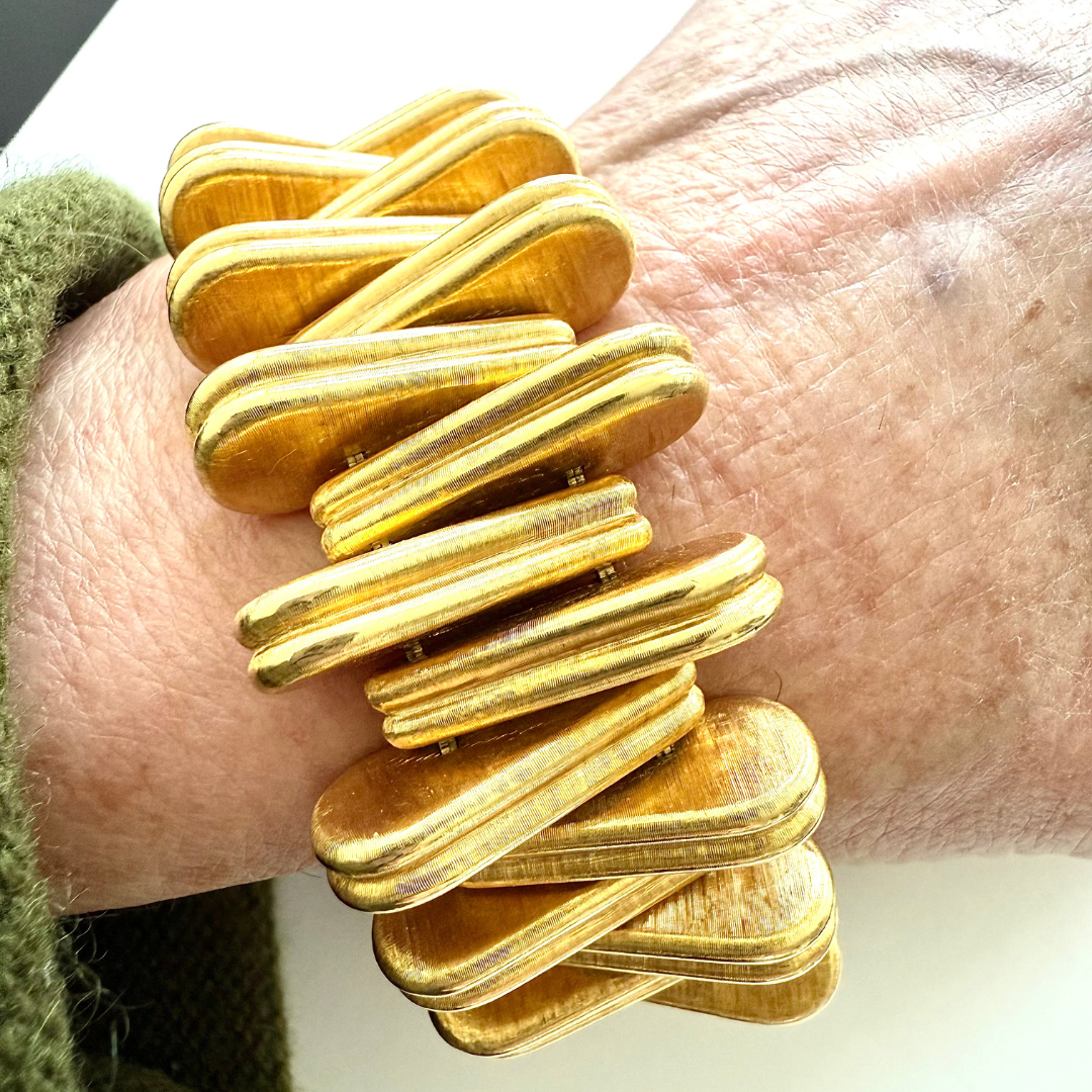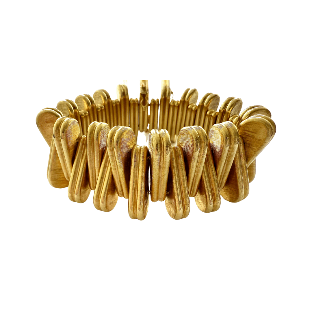 An eighteen carat gold standout, this seventies articulated Cartier design features ribbed teardrop shaped links of brushed finish on one side, polished on the other. Numbered 55719, 112.7 grams. Fits most wrists. Collectible Cartier Chic.