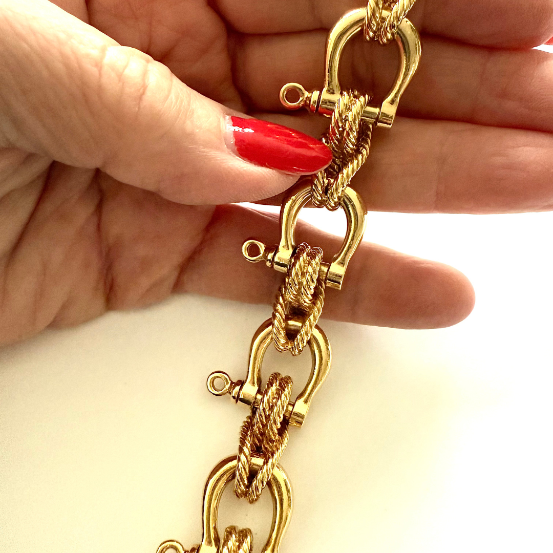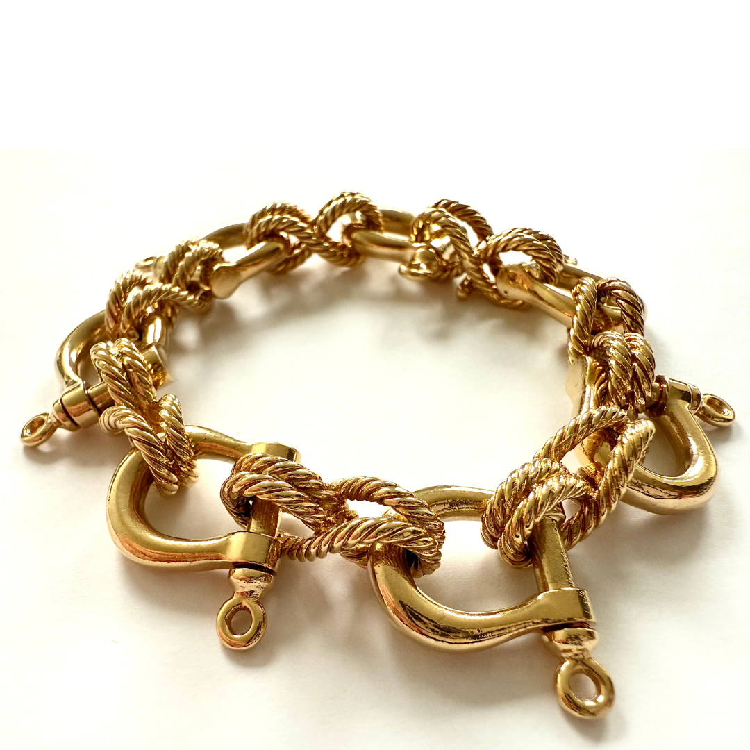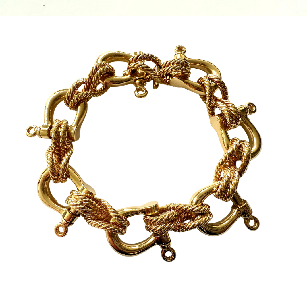 Gaetan de Percin was an atelier, best known for their designs for Hermès. This abstract rift on stirrups joined by a textured rope twist makes for a super chic and unusual bracelet. 18k, 96.1 grams. Eight inches long.