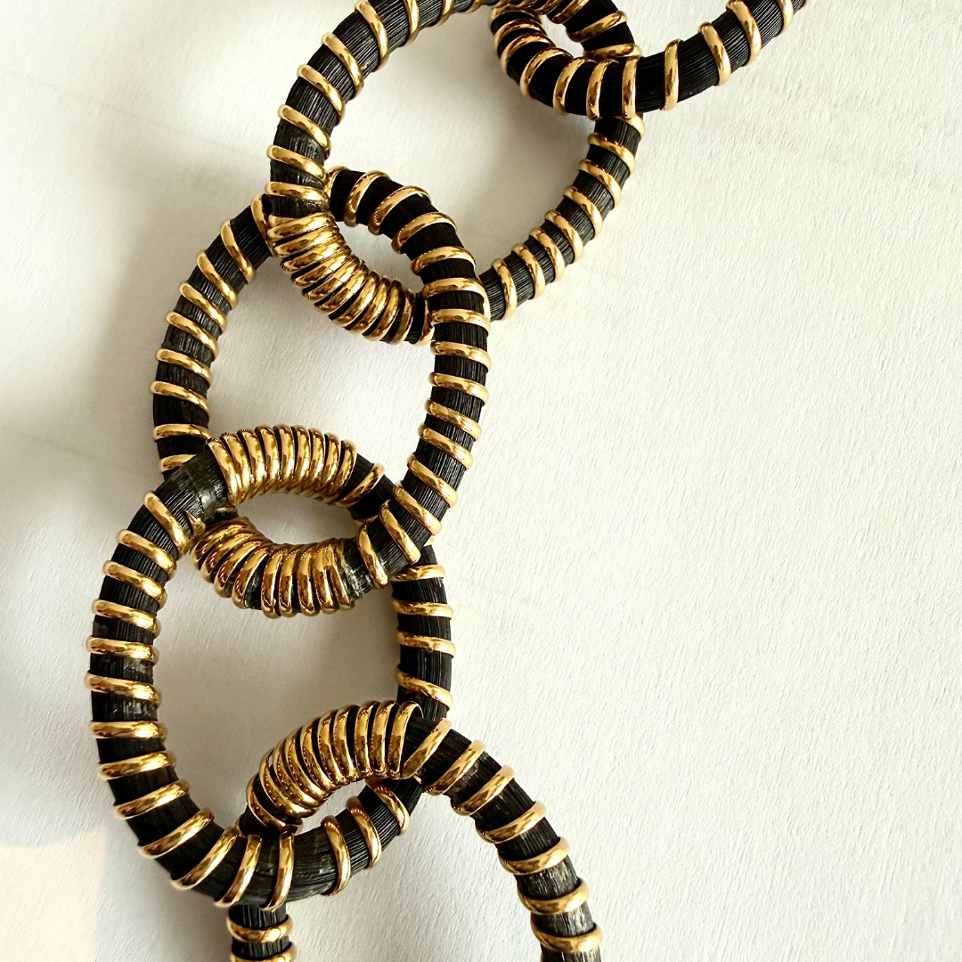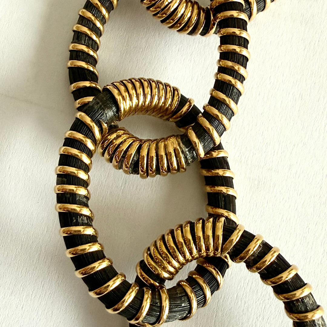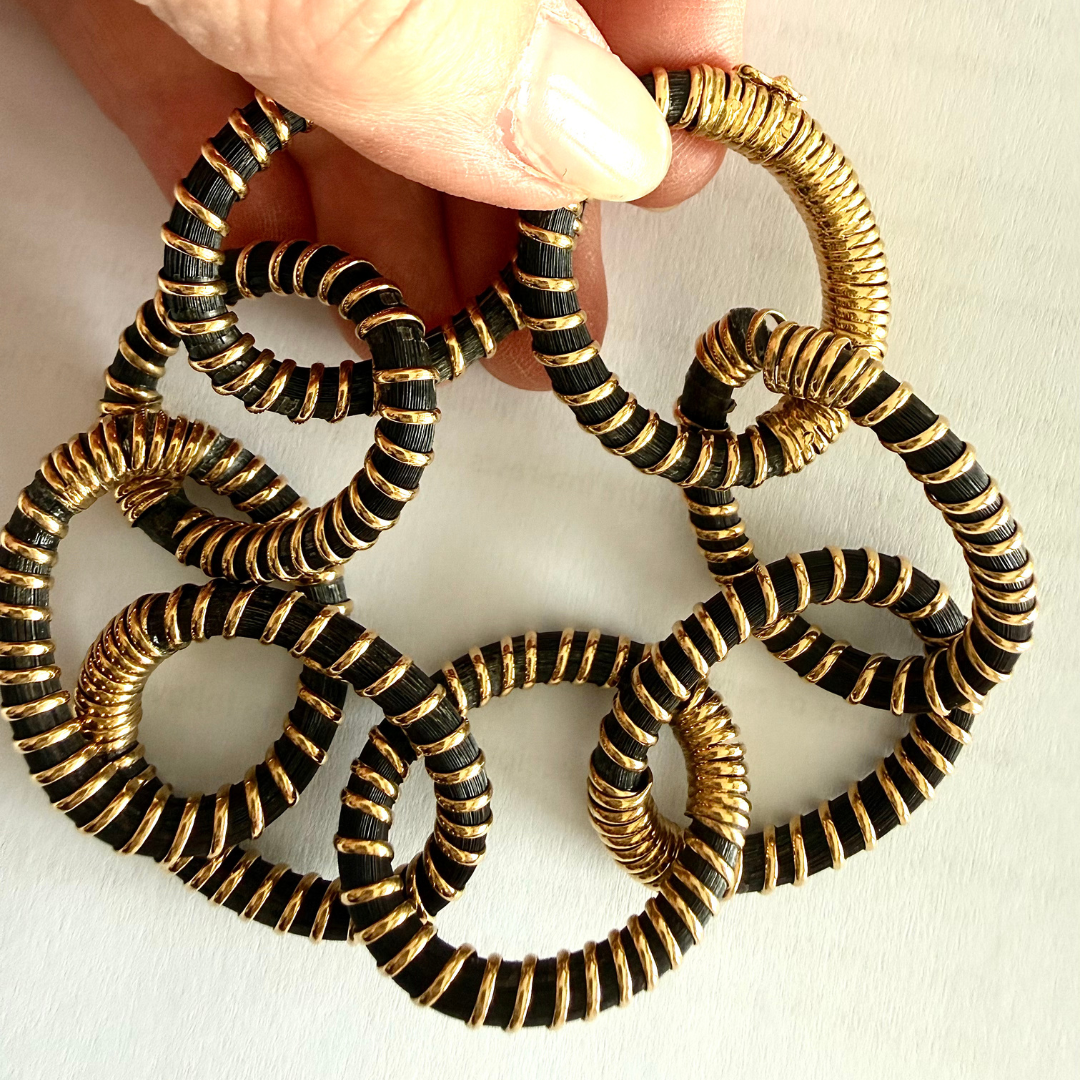 The most intriguing and unusual seventies elephant hair and eighteen carat gold bracelet we have seen, this one by Hermès. Signed, 8.5 inches long (easy to remove a link), 41.6 grams. With hidden closure and safety clasp.