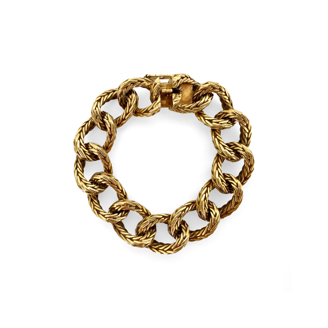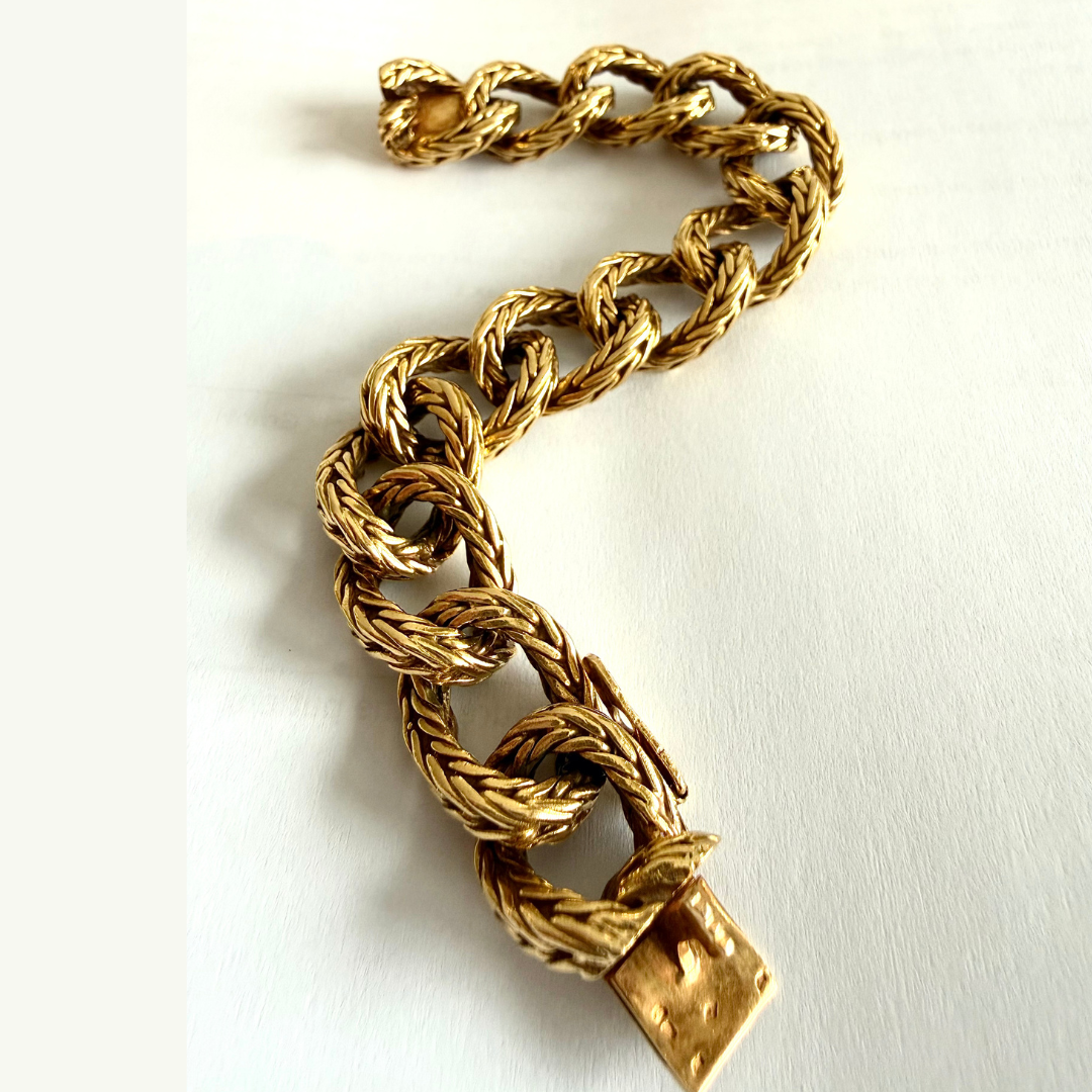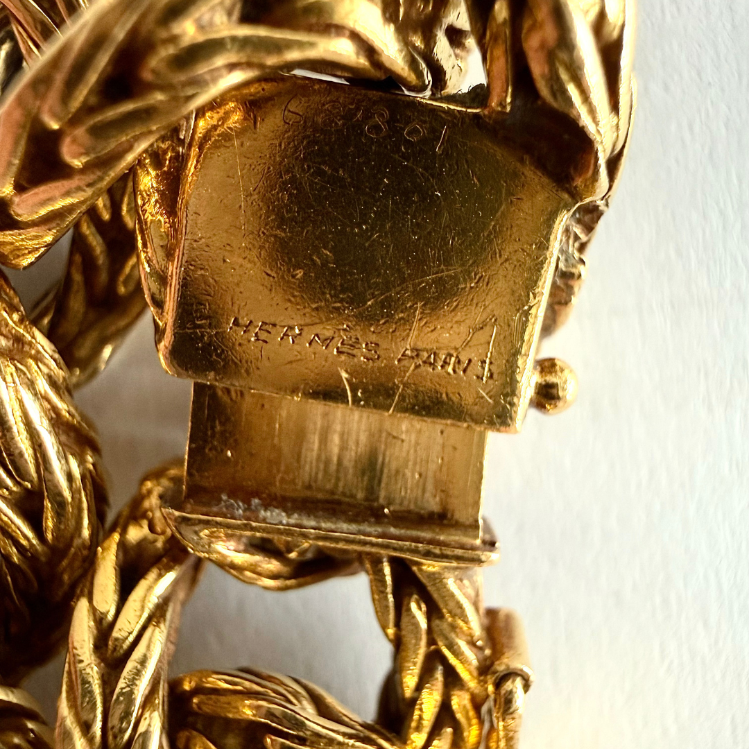 Featuring roped gold links with polished tops, this chic seventies Hermès design weighs in at a generous 117 grams. 7 3/4 inches long, signed Hermes. Perfect stacked or solo.