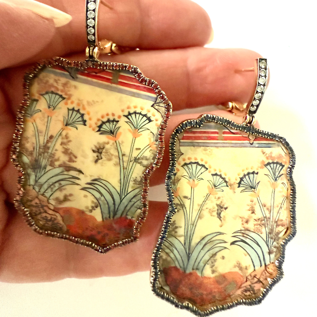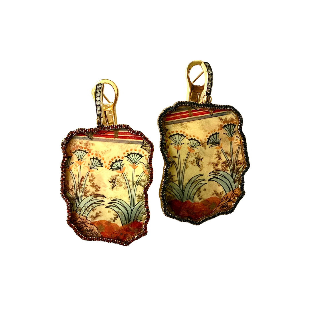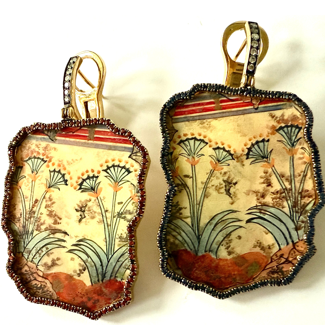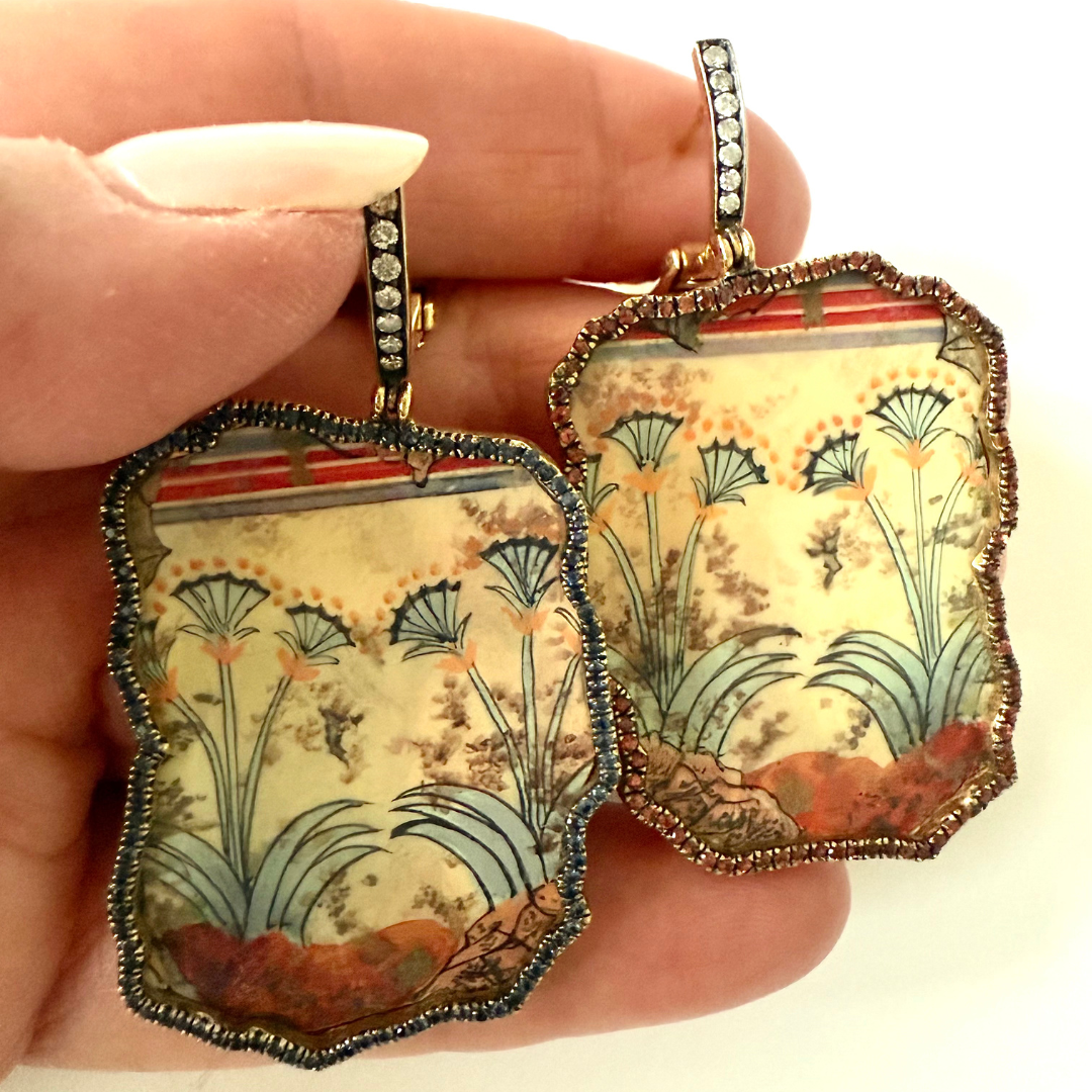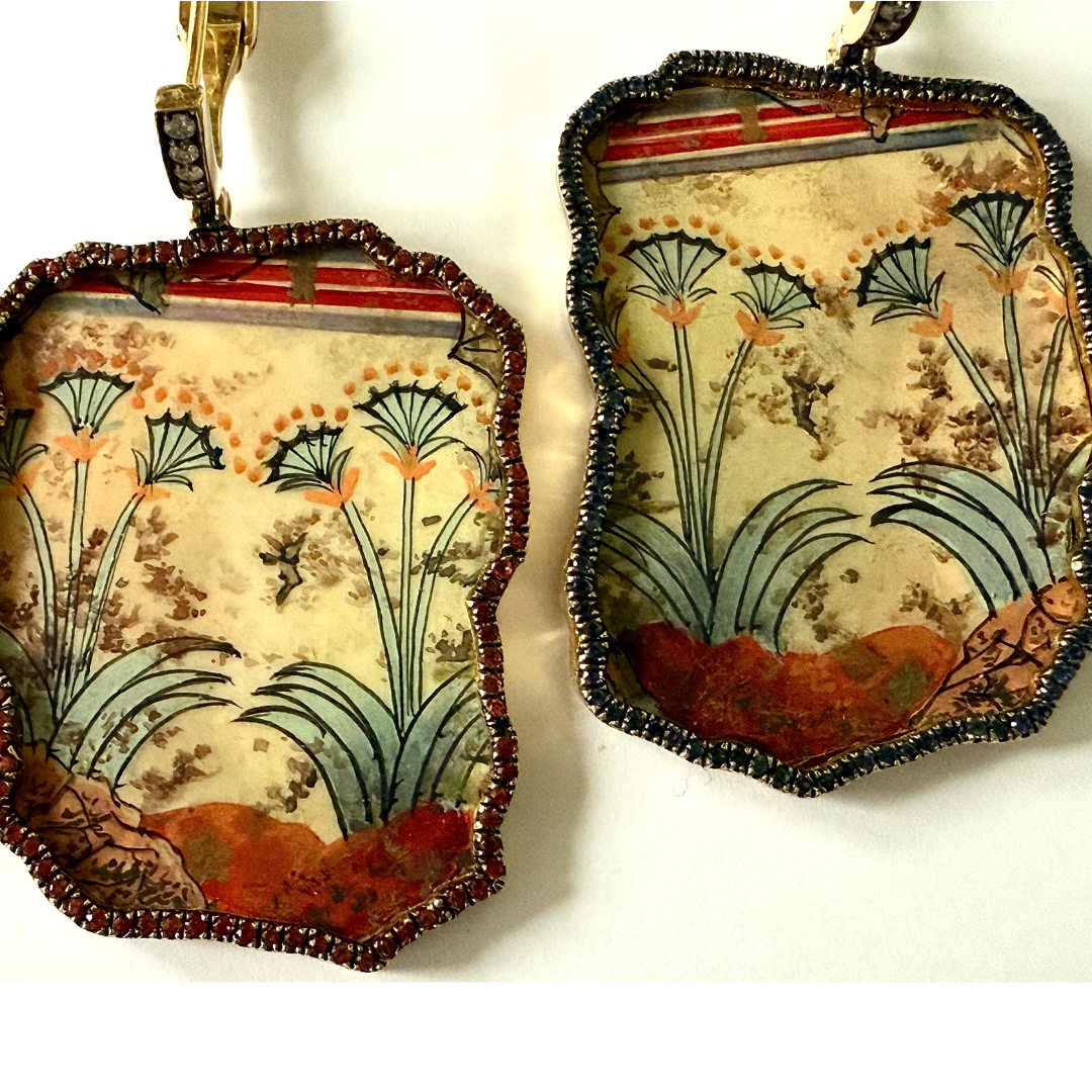A design from the papyrus frescos from the Room of the Ladies at Akrotiri, Thera in Greece. Cycladic artists may have borrowed iconography here from Egypt or Minoan Crete. The original art dates from 17th century BCE and may be viewed at the Museum of Prehistoric Thera in Santorini. A nod to the past with a very modern design.